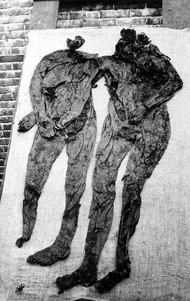 In late June 1904,  a Dutch farmer named Hilbrand Gringhuis was out cutting peat on the Netherlands side of  Bourtangermoor  when he uncovered something very unsettling:  a withered, nearly headless body resting,  it seemed, upon the arm of a second corpse.   Gringhuis immediately notified the local police,  who came out to investigate.  And,  in a time long before modern forensic science, the local constabulary decided to transfer the soggy cadavers to the nearest morgue in a very peculiar  fashion.